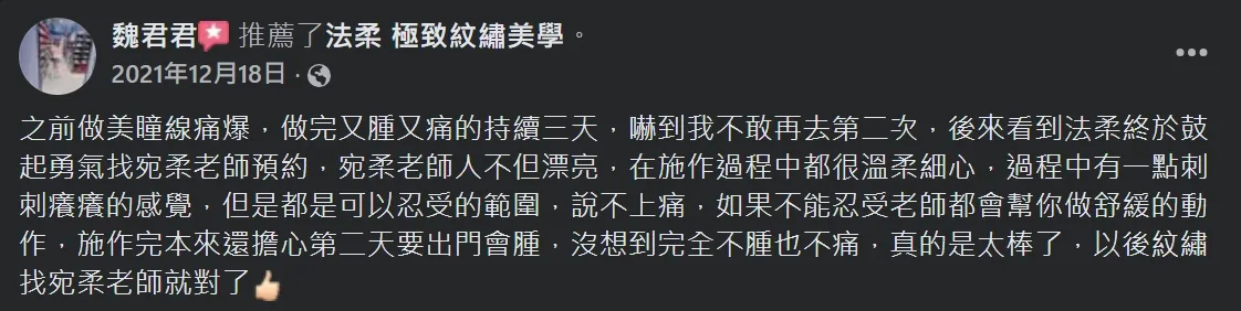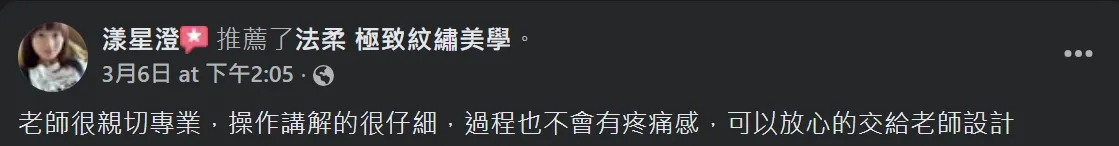 老師很親切專業,操作講解的很仔細,過程也不會有疼痛感,可以放心的交給老師設計
